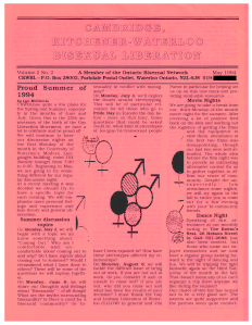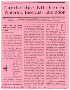 Publishing History: Issued by Cambridge, Kitchener-Waterloo Bisexual Liberation (CKWBL) from 1994, January 6 to 1995, January. We have not yet been able to establish a complete publishing history for this publication. The three issues listed below are in our collection. There are a couple of entries at the ArQuives that may represent other issues, but they are difficult to interpret. It is possible that these three issues were the only ones published. Copyright Permission: Copies of individual issues of Cambridge, Kitchener-Waterloo Bisexual Liberation [Newsletter] have been reproduced with the kind permission of its copyright holder, Lyn McGinnis. No further reproduction is permitted. Telephone Numbers & Email Addresses: These documents were published many years ago. Please do NOT use them as a source for telephone numbers or email addresses for local businesses or agencies. Reliable sources for that kind of information include http://www.canada411.ca/ and other search engines on the Internet. Redaction: Certain parts of the digitized text have been blacked out in accordance with our Redaction Policy . The Grand River Rainbow Historical Society maintains a separate collection of unmarked (unredacted) copies of the issues of this magazine for consultation as necessary. |