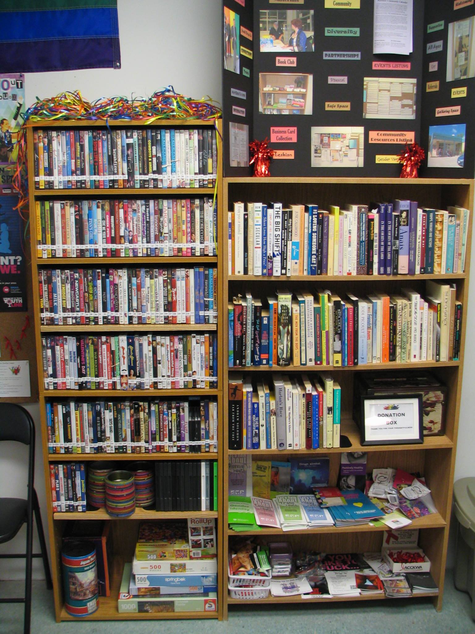 This is a photo of SPECTRUM's Liibrary of books and DVDs in the early days..