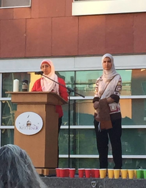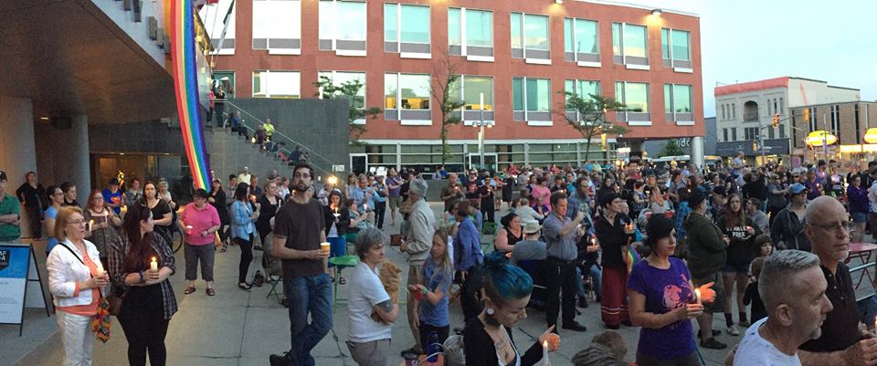 On June 12, 2016, Omar Mateen, a 29-year-old man, killed 49 people and wounded 53 more in a mass shooting at Pulse, a gay nightclub in Orlando, Florida, United States. Mateen stated that he swore allegiance to the leader of the Islamic State of Iraq and Syria. This shooting had potential for creating division between two marginalized groups in the Western world: the LGBTQ+ community and Muslim communities. Two days later, various group in Waterloo Region organized a vigil to mourn and to affirm solidarity between these two marginalized groups. One photo is a shot of the crowd in front of Kitchener City Hall. The other photo is of two of the several speakers at the event - Fauzia Mazhar and Sarah Shafiq of the Coalition of Muslim Women of KW. |