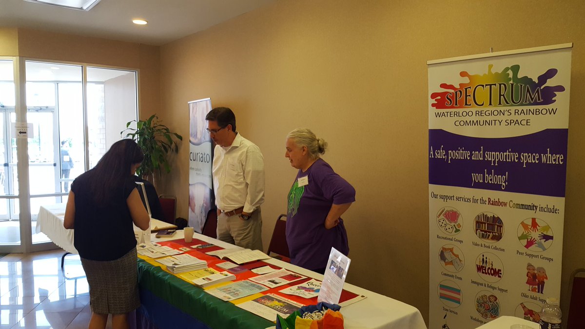 SPECTRUM's Aging with Pride Committee had an information table at the Innovation Summit organized by the Schlegel-UW Research Institute for Aging (RIA), which was held at the Kitchener Holiday Inn. Cait Glasson and Tom Connelly are shown staffing the table. The second photo gives a close-up of several pertinent SPECTRUM publications on the table. |