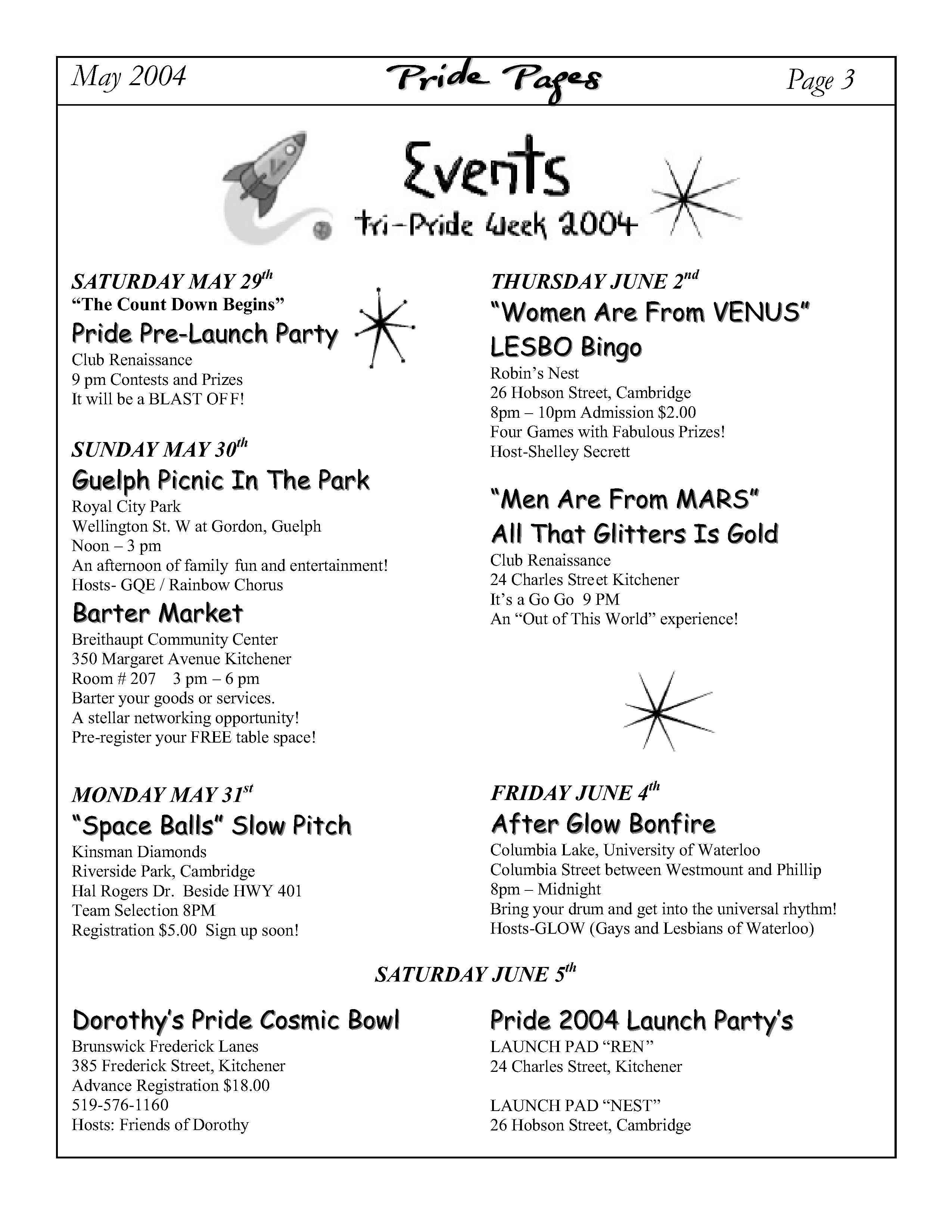 | 2004, June 2 (Thursday) | There is an ad for this on p.3 of the Pride Pages for 2004, May. | JPEG file [460 K.] |