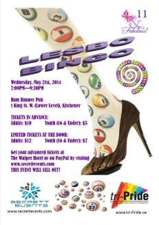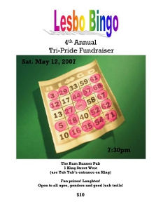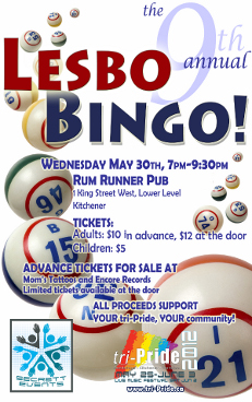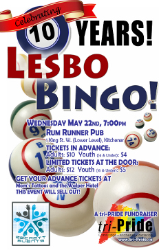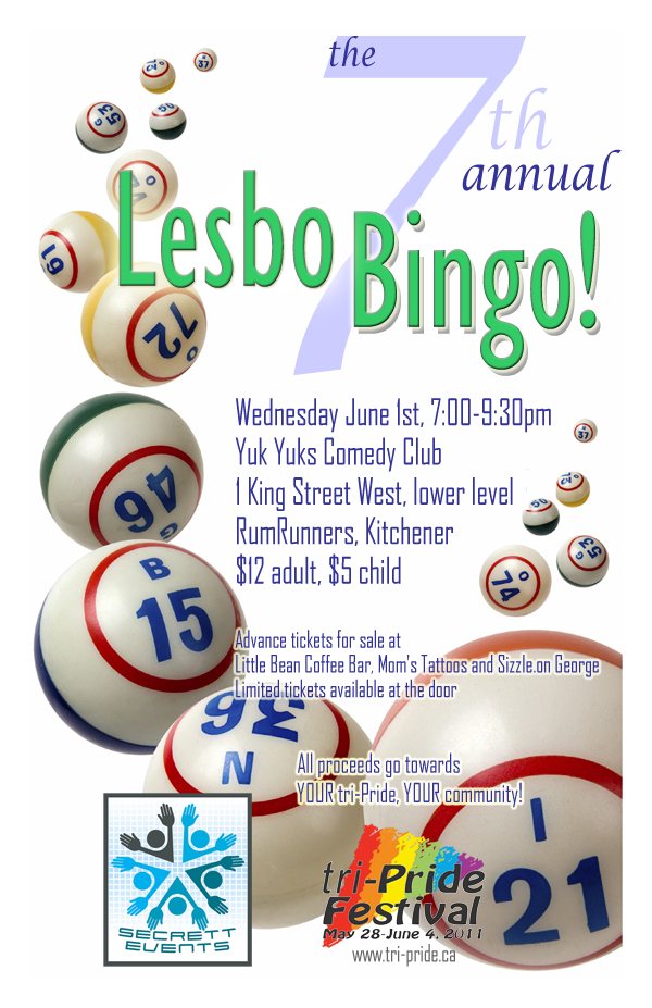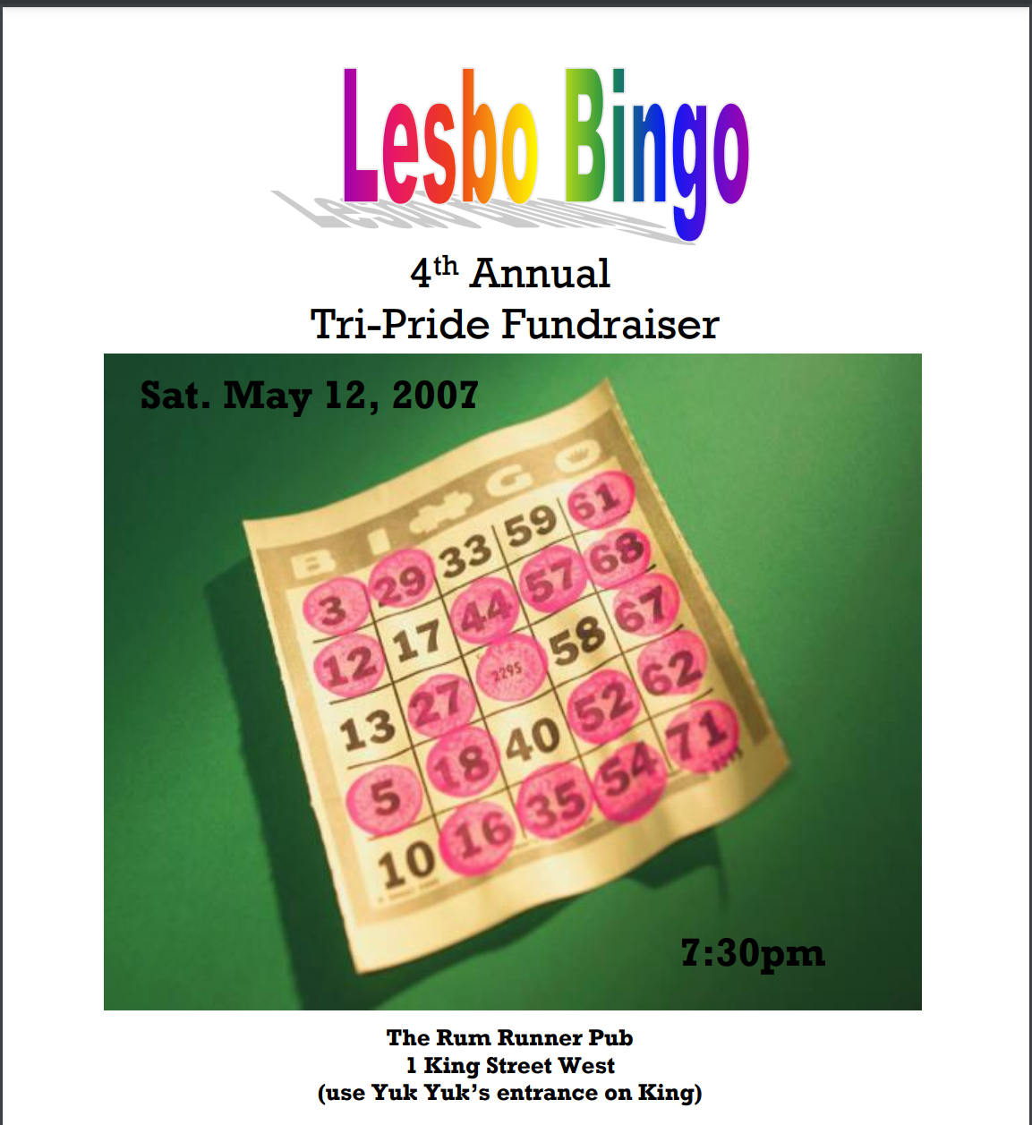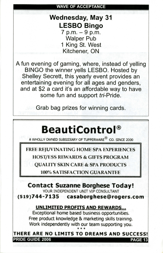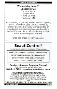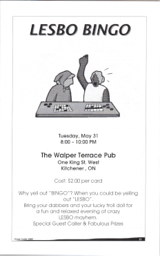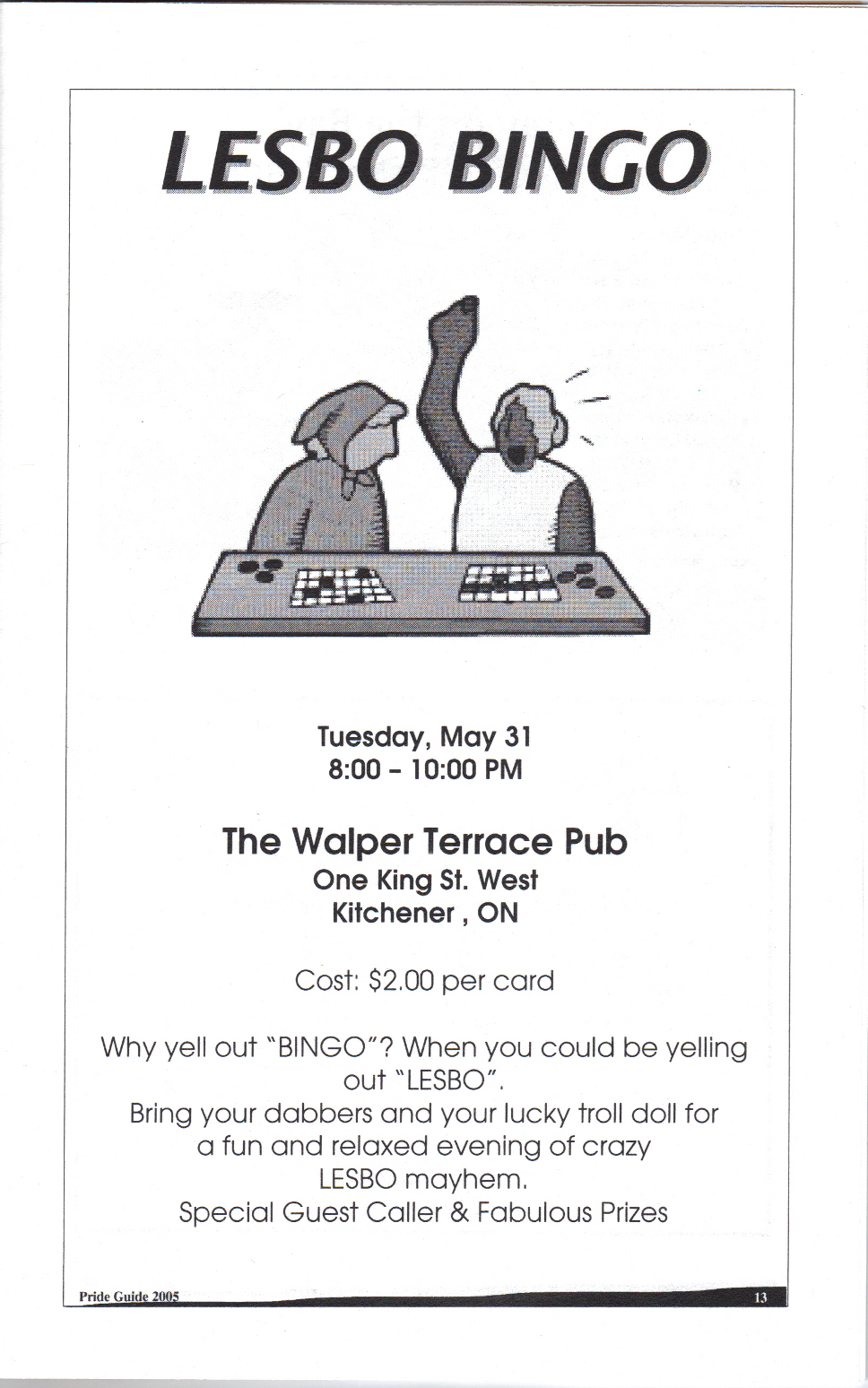 Event History: Lesbo Bingo events began in 2004. Copyright Permission: Copies of documents related to Lesbo Bingo have been reproduced with the kind permission of its copyright holder, Shelley Secrett. No further reproduction is permitted. Telephone Numbers & Email Addresses: These documents were published many years ago. Please do NOT use them as a source for telephone numbers or email addresses for local businesses or agencies. Reliable sources for that kind of information include http://www.canada411.ca/ and other search engines on the Internet. Redaction: Certain parts of the digitized text have been blacked out in accordance with our Redaction Policy . The Grand River Rainbow Historical Society maintains a separate collection of unmarked (unredacted) copies of the issues of this magazine for consultation as necessary. |