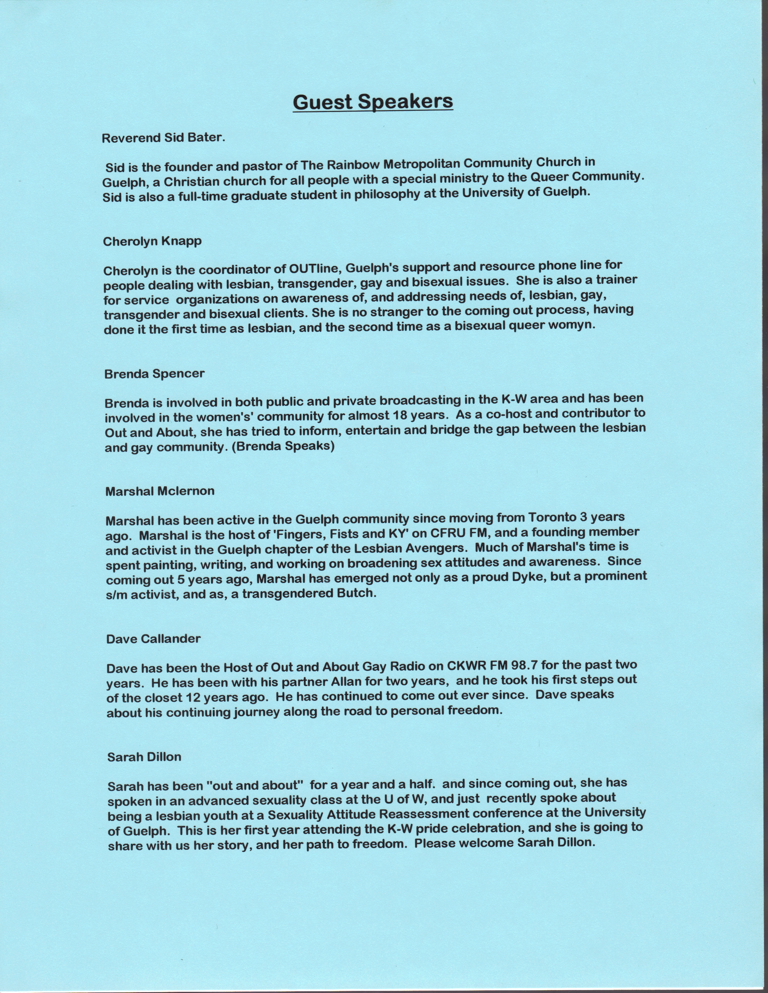 “Guest Speakers” - A list of the six guest speakers for the event. Printed on 27.9 cm x 21.6 cm (11.0" x 8.5") paper. |