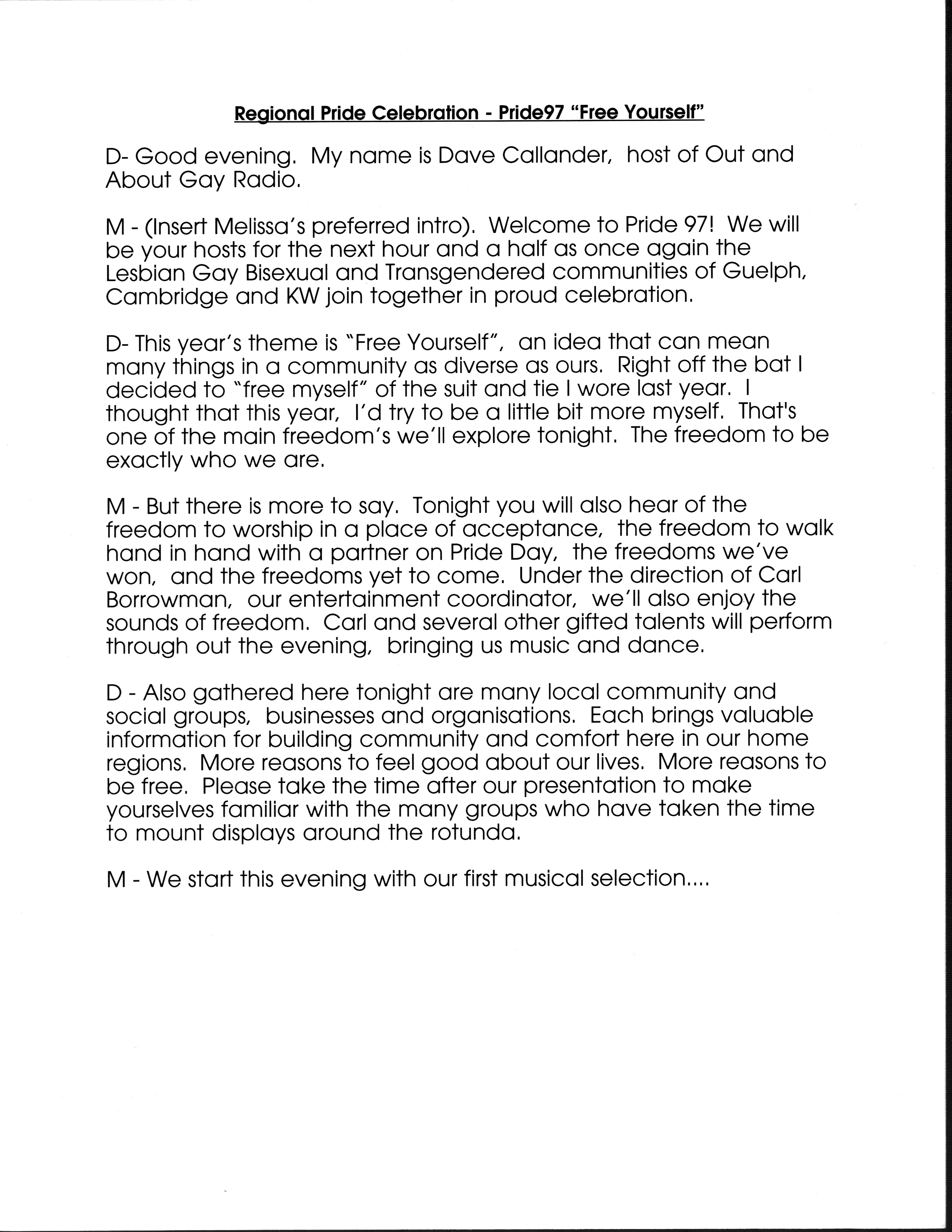 Pride '97: Remarks by the Hosts, Melissa MacDonald (later Melissa Sky) and