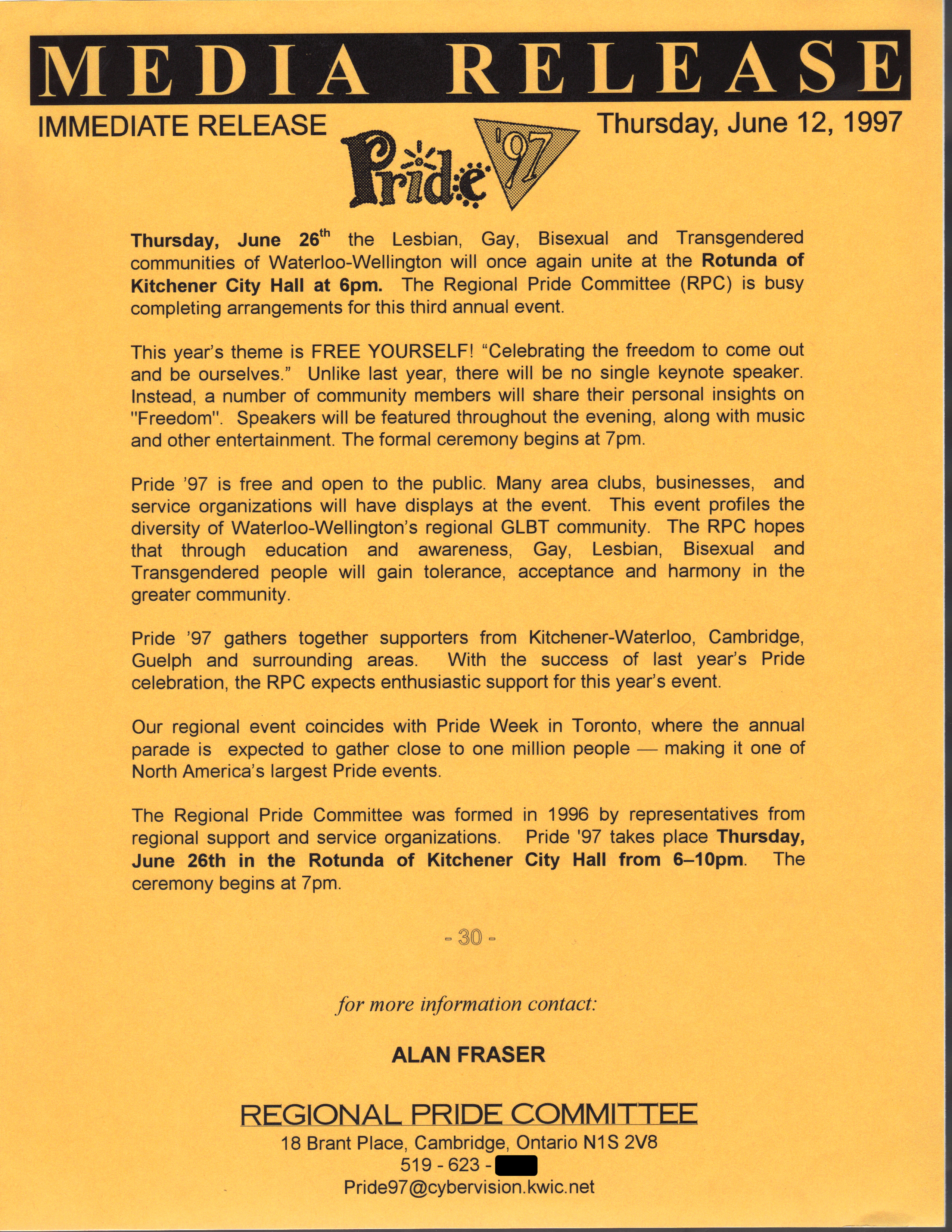 Media Release for Pride '97, dated Thursday, June 12, 1997, and issued by