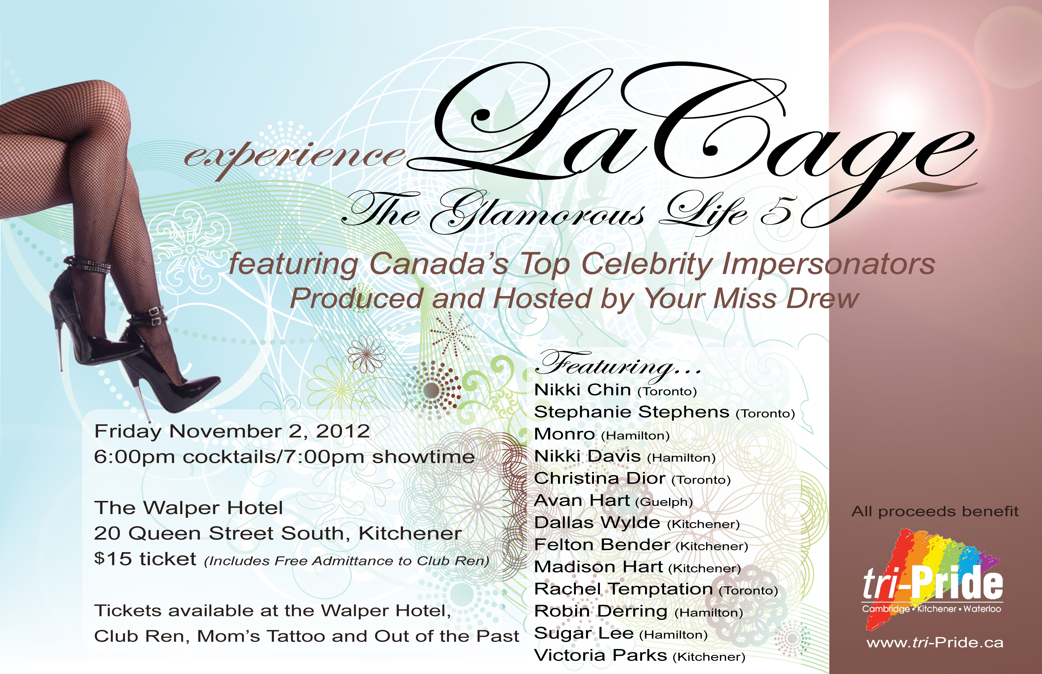 The programme is a 4-page booklet. The front cover is headed “Experience La Cage - The Glamorous Life 5.” and includes the text “featuring Canada's Top Celebrity Impersonators Produced and Hosted by Your Miss Drew. Friday, November 2, 2012, 6:00 pm cocktails/7:00 pm showtime. The Walper Hotel, 20 Queen Street South, Kitchener.” The following three pages provide bios of 14 performers at the event. |